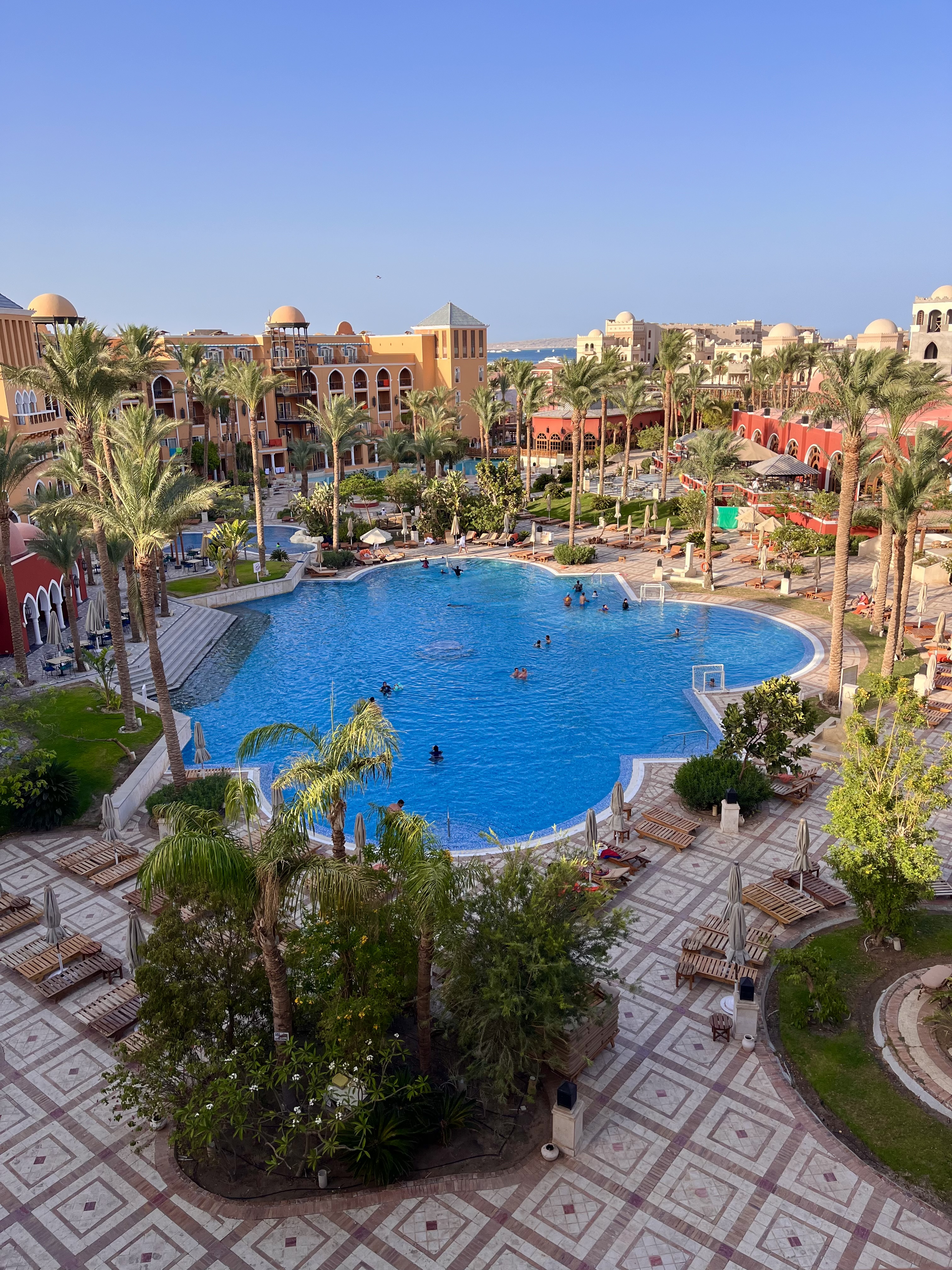 Na stolíku sú položené poháre na papierovom obrúsku s motívom adventného venca. Balansujem medzi ocenením egyptského zmyslu pre humor a totálnym mámvpičizmom. Odhrniem záves a dostávam otravu modrou farbou. Modrý bazén, modré nebo a v diaľke modré more. Situáciu zachraňujú zelené palmy a ľudia v tónoch od bielej, cez ružovú až po hnedú v závislosti od dĺžky pobytu.