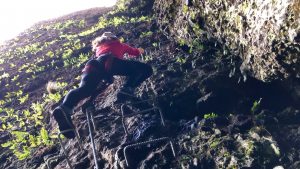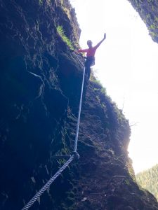 Po prvej ferrate teda nestúpam, ale zostupujem po železných stupačkách pozdĺž oceľového lana, ktoré sa tiahne naprieč všetkými ferratami. Problém na tejto trase by ste mohli mať, ak patríte skôr ku krátkonohej časti populácie. Niektoré stupačky sú totiž zákerne ďaleko od seba a pravdepodobne skonštatujete, že si už ani nepamätáte, kedy ste naposledy takto naširoko roztiahli nohy.