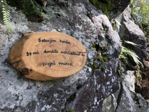 Stretávame sa na mieste, kde vyúsťujú dve trasy ferrát. Jedna sem vedie práve po tom rebríku, na ktorom sa mi roztriasli ruky až tak, že Igorovi z nich vypadol telefón a druhá, jednoduchšia, vedie cez jaskyňu. Poslušne nasledujeme pokyn „Oddýchni si“ na drevenej lavičke a slušne uvoľňujeme oceľové lano, o ktoré sme celý čas istení pre ostatných lezcov, aby nás predbehli. Aj tí však poslúchajú lavičku a oddychujú.