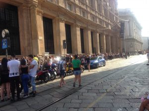 S otvorenými ústami zostávame pozerať aj na neskutočne dlhý rad, kde stoja doslova stovky ľudí a čakajú. Zatiaľ nevieme na čo, ale sme pripravení to zistiť. Môj osobný tip je, že sa jedná o detašované pracovisko seredskej pošty. Ako však zisťujeme od človeka, ktorý v tomto rade stojí, všetci títo ľudia čakajú a ešte hodiny čakať budú NA KÁVU!!! Starbucks tu totiž práve otvára svoju úplne prvú pobočku v Taliansku a ja mám pocit, že do tých otvorených úst každú chvíľu chytím prievan! NA KÁVU???? Nechápem a ešte dlho chápať nebudem, ako dokázal Starbucks vybudovať značku, kvôli ktorej sú ľudia ochotní čakať hodiny na kávu a ešte sa z toho aj tešiť.
