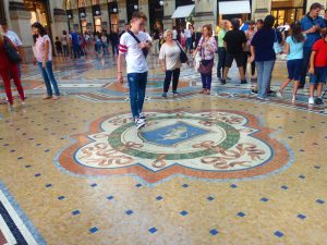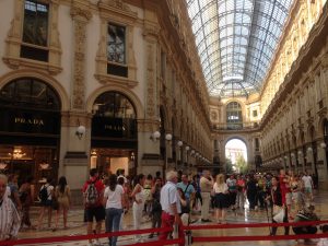 Sedíme v nákupnej pasáži Galleria Vittorio Emanuele II, čo je miesto, kde nájdete tie najdrahšie a najluxusnejšie značky, aké si len viete predstaviť. Podlaha je zdobená mozaikami, steny typickými gotickými oblúkmi a preskleným stropom sem preniká mäkké svetlo. Cez ruch nákupnej pasáže práve prechádza slušne oblečený starší pán a hrá si na fúkaciu harmoniku. Chvíľu nato nám pred očami pochoduje niekoľko desiatok šermiarov oblečených v bielych šermiarskych úboroch. Vedela by som tu hodiny len tak sedieť, pozorovať ľudí a vstrebávať atmosféru.