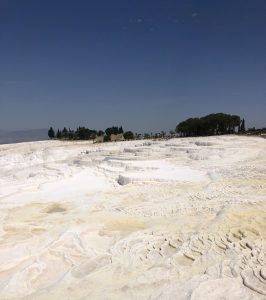 Netrepali sme sa zbytočne! O pár metrov ďalej mi vyráža dych ten obraz z môjho zošita snov a vyzerá presne tak, ako som dúfala! Snehobiele terasy s modrými jazierkami, ktoré vznikali tisícky rokov vďaka vysoko mineralizovanej vode bohatej na vápnik, vyvierajúcej na vrchole hory. Tento proces začal vďaka tektonickému zlomu, je veľmi pomalý, stále trvá a za ideálnych podmienok bude aj naďalej pokračovať. Tie podmienky však úplne ideálne nie sú. Kvôli nedostatku vody je mnoho jazierok vyschnutých, tak ako tie, ktoré ma vystrašili na začiatku. Čo ma šokovalo najviac je, a teraz vám zbúram ideály, že tie bazéniky, v ktorých sa dá kúpať sú umelo vytvorené! Stalo sa tak po roku 1988, keď sa Pamukkale zapísalo do svetového dedičstva UNESCO. Dotiaľ bolo toto miesto veľmi necitlivo ovplyvňované turizmom a dokonca z neho okolité hotely čerpali minerálnu vodu do svojich bazénov. Umelé betónové bazény za ten čas už stihli obrásť travertínom, takže rozdiel ani nepostrehnete.