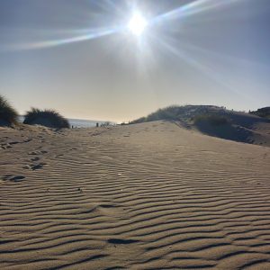 Z lesíka v ktorom parkujeme sa doslova vysýpa piesok a hneď za pásom stromov sa týčia pieskové duny za ktoré zapadá slnko. Vyzúvam sa už v aute a tuším, že tento zážitok bosými nohami bude výnimočný. Na povrchu dún vietor nakreslil milión pravidelných vlniek a zapadajúce slnko sa odráža v nekonečne ligotajúcich sa zrniečok jemného piesku. Nechávam v ňom moje stopy a on tie svoje vo mne…