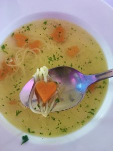 Bozkávacia pesnička končí a ja konečne dostávam naspäť svoj tanier. Nakladám si poriadnu porciu a jedným očkom pozorujem ako sa ľudia pri jedení tvária. Netrpím úchylkou, že by mi spôsobovalo potešenie pozorovať ľudí pri jedle. V polievke však namiesto mrkvy nakrájanej na kocky, plávajú mrkvové srdiečka a tak som zvedavá, či bude tento detail, s ktorým bolo toľko práce, vôbec povšimnutý.