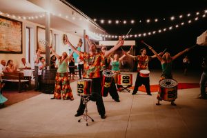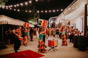 Je kúsok pred deviatou a dostávam echo, že bubeníci sa už pripravujú v mojom svadobnom bunkri, kde som sa obliekala do šiat. S nadšením o tom informujem ľudí, ktorých stretávam cestou ako ich utekám privítať. Igor so svojím širokým, no stále skromným úsmevom už z diaľky otvára náruč na znak pozdravu. Kráčame spolu obzrieť terén, aby sme našli najlepšie miesto na hranie.