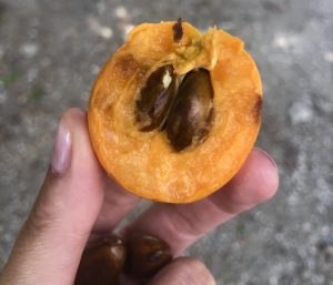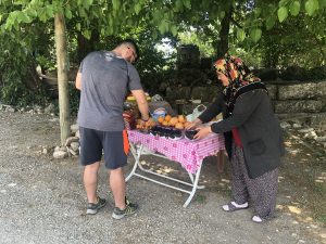 S otvorenými oknami na aute kvôli výmene vzduchu, ktorý sa stihol zohriať na teplotu nezlúčiteľnú so životom, prechádzame okolo stánku s ovocím. Pod pojmom stánok s ovocím rozumej stolík pod stromom s ružovým gumeným obrusom so štvorčekovou potlačou, hojne naložený morušami, pomarančami, grapefruitami a ďalším ovocím, ktoré neviem identifikovať. Plastové vaničky a sáčky sú samozrejmosť, nad ktorou sa tu nikto ani nepozastaví. Od stolíka nám zamáva turecká babička zahalená v šatke, v dlhom svetri, vzorovaných širokých nohaviciach a bodkovaných šlapkách, z ktorých vytŕčajú biele ponožky. Aj napriek skromnému počtu zubov je jej úsmev taký podmanivý, že nás to prinúti okamžite dupnúť na brzdu. Berieme si dve vaničky morúš, z každého ovocia zopár kusov a turecká babička nám k tomu balí navyše ešte jeden grep aj s lístkami. Po anglicky samozrejme nerozpráva a tak nám nevie povedať, koľko platíme. Na pomoc jej prichádza druhá turecká babička, lebo dve nehovoriace po anglicky sú vždy viac ako jedna. Na počudovanie nás zdraví celkom dobrou angličtinou a aj keď jej slovná zásoba pri číslovkách pravdepodobne končí, nateraz je to úplne postačujúce. Odchádzame s plnými sáčikmi ovocia, v prepočte za príjemných tri päťdesiat eura. Okamžite sa púšťame do tmavých morúš, ktoré sú presne také, ako som dúfala. Na absolútnom vrchole zrelosti, extrémne sladké a doslova rozpúšťajúce sa v ústach. S fialovými prstami po tomto kulinárskom zážitku skúmam to neidentifikovateľné čudo, ktoré vyzerá ako väčšia guľatá oranžová slivka a chutí asi ako päť rôznych ovocí dokopy. Je sladké, šťavnaté, s viacerými hnedými lesklými kôstkami. Ako správny pestovateľ ich nevyhadzujem, ale beriem domov na zasadenie ako suvenír namiesto magnetky.