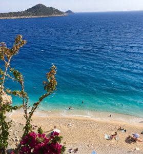 Kaputaş beach je pláž, ktorá je z každej strany chránená útesom a leží hlboko pod úrovňou cesty. Dostanete sa k nej bez problémov po schodíkoch a prechádzku vám ešte spríjemní ružová bugenvilea, čo sú všadeprítomné kvitnúce kríky. Jej názov som si práve vygooglila, lebo si ho neviem zapamätať. Voda je azúrovo modrá a spokojní budú ako milovníci piesku, tak aj kameňov, lebo na tejto pláži nájdete oba varianty. Kamienky sú navyše malé a príjemné, nie ako tí včerajší zlosynovia. Ani neviete ako sa vám dostanú do podprsenky a budete sa čudovať, z akých iných rôznych miest ich pri prezliekaní ešte vytrasiete.