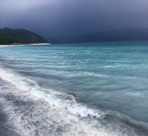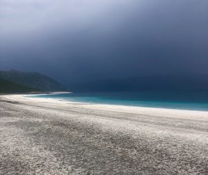 Zvyčajne uprednostňujem slnečné počasie, no tá apokalypsa, ktorú pozorujem cez okienko auta vytvára v kontraste s tyrkysovou vodou a zvláštnym bielym brehom atmosféru ako z inej planéty. Túto podobnosť som vyslovila ešte skôr, ako som zistila, že v skutočnosti nie som až tak ďaleko od pravdy. Hydromagnezit, minerál, ktorý bol objavený v usadeninách na brehu jazera Salda sa nenachádza nikde inde na Zemi a je podobný uhličitanovým minerálom objaveným na povrchu krátera Jezero na Marse. NASA dokonca zverejnila na svojej stránke fotky tureckého jazera Salda ako ilustráciu toho, ako vyzeralo to marťanské pred miliardami rokov, keď tam bola voda v tekutom skupenstve. Keby chcela NASA priblížiť, ako to na Marse vyzerá čerstvo po dopade meteoritu, nech ma neváha kontaktovať. Moja skriňa s oblečením je k dispozícii na fotenie kedykoľvek a na cene sa dohodneme.